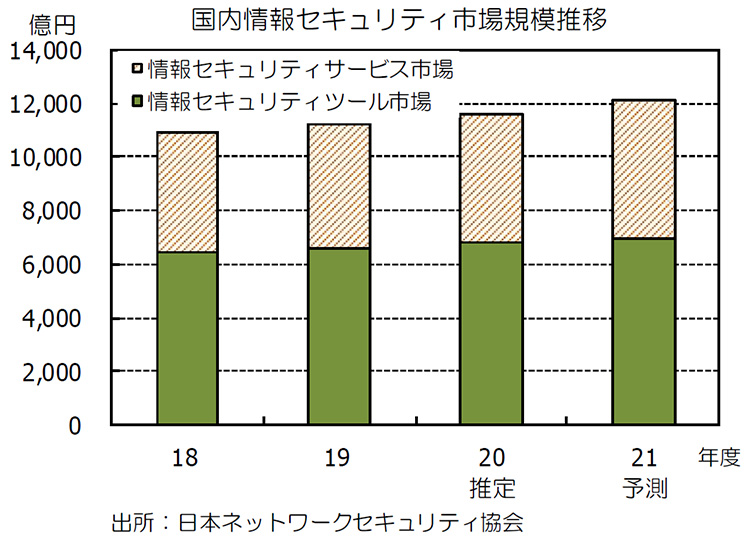 神様:その通りです。日本セキュリティネットワーク協会は、2021年度の国内情報セキュリティ市場規模をツールとサービスの合算で1兆2,127億円と予測しています。ここで言う「ツール」とはウイルス対策ソフト、ファイアウォールや個人認証用デバイスなどのソフトやハードを提供すること、「サービス」とはコンサルティング、インシデント対応、電子証明書の発行やリテラシー教育などのサービスを提供することを言います。