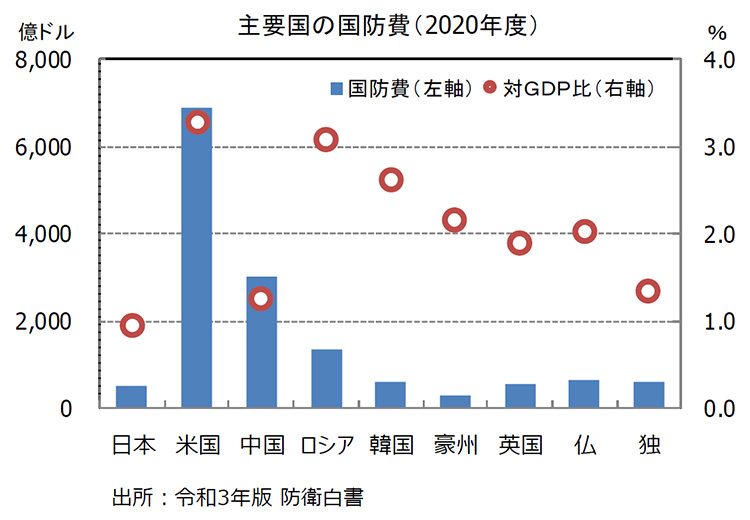 神様:その通りです。例えば、防衛費について見てみましょう。令和4年度の日本の防衛関係費(当初予算)は、前年度比で553億円増の5兆1,788億円となりました。これは10年連続で右肩上がりでの増加です。一方で、2020年度の主要国の国防費を見てみると、国防費が実質国内総生産(GDP)に占める比率は、G7諸国やオーストラリア、韓国、ロシア、中国と比較すると日本が最も低いのです。