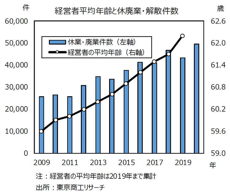 神様:その通りです。日本では少子高齢化により、経営者の高齢化が進んでいます。2019年時点での経営者の平均年齢は62.2歳と言われています。中小企業基盤整備機構によると、直近の23年間で経営者の年齢のピークは47歳から69歳にシフトしたとされます。経営者の高齢化が進むにつれて企業の休廃業や解散も伸び続けています。今後増加する可能性のある企業の倒産は、コロナ禍によるものだけでなく、経営者の高齢化や後継者の不在によるものも要因としてある、ということです。