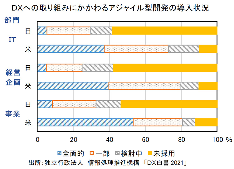 神様:その通りです。日米で比較した場合、日本国内の企業によるアジャイル型開発の導入実績は遅れています。様々な理由がありますが、アジャイル型に十分に精通している開発者が少ないことも理由のひとつです。DXを加速させるためには、アジャイル型開発への移行も大きなポイントとなるでしょう。