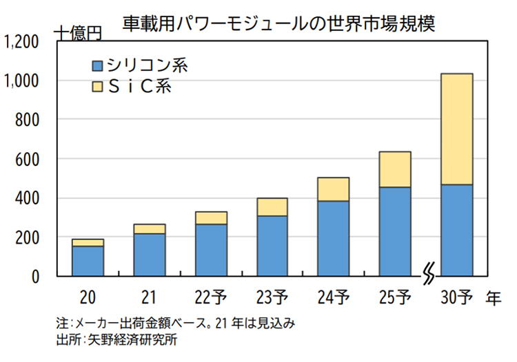 T:車載用パワーモジュールの世界市場規模を見ると、現在はシリコン系パワー半導体がほとんどですが、今後は高性能なSiC系パワー半導体が大きく伸び、2030年にはシリコン系パワー半導体と同じくらいの割合にまで伸びる見込みですね。モジュールの小型化などでより多様な種類のBEVが登場するのでしょうね。