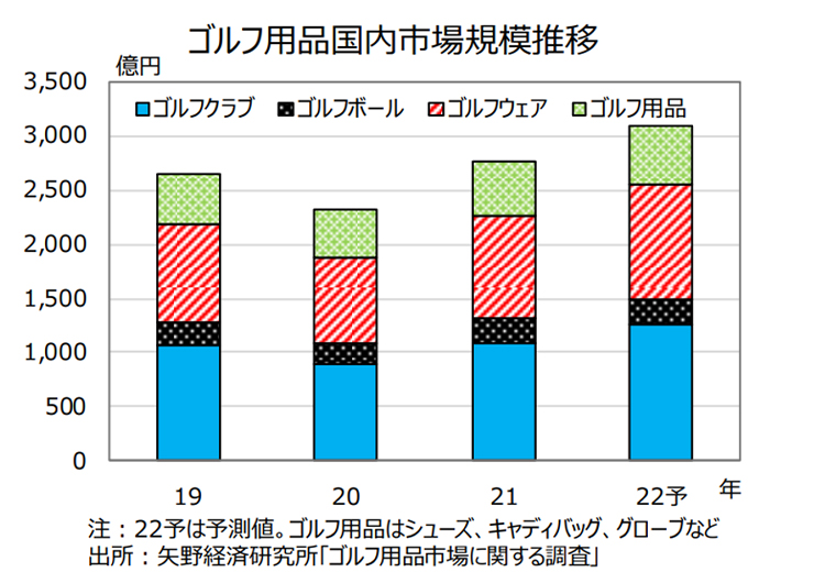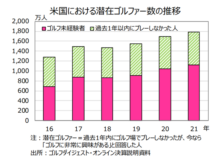 神様:広い自然の中で密を避け、ストレス発散もできるものが好まれていますね。しかし、日本国内のゴルフ人気はコロナ禍だけの一時的なものではなさそうで、市場の拡大が続いています。矢野経済研究所の調査によると、2022年のゴルフ用品国内市場は前年比で11.9%増の3,092億円になり、2021年に続いて二桁の成長が続く見通しです。ゴルフ場の数やプレイ人口が世界1位である米国でも、ゴルフ人気はさらに高まっています。過去1年間にプレイしていない、または未経験だがゴルフに非常に興味があると答えた「潜在ゴルファー」が増え続けており、今後もゴルフをプレイする人の増加が見込まれます。