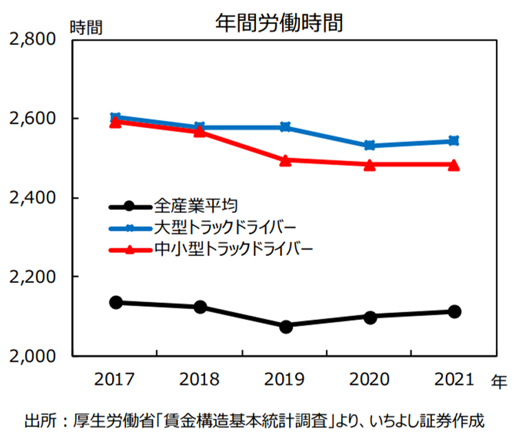 神様:2021年のトラックドライバーの年間労働時間を見ると、全産業平均と比較して、大型トラック運転者で432時間(月36時間)長く、中小型トラック運転者で384時間(月32時間)長い状況です。その一方で、年間所得は全産業平均と比較して、大型トラック運転者で約5%低く、中小型トラック運転者で約12%低いのです。