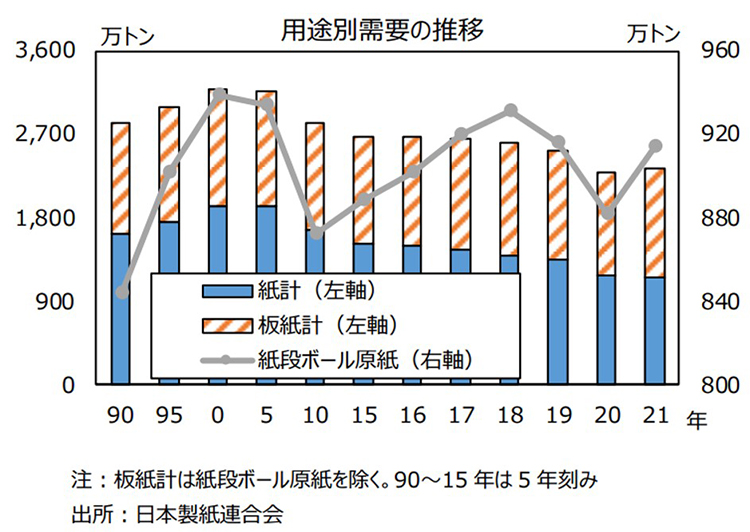 神様:そう、「紙」です。紙の需要は、新聞や雑誌の電子化などにより年々減少しています。国内の製紙メーカーは、洋紙の中長期的な需要低減により、海外事業や輸出に注力し、他事業を展開するなど、事業構造を転換しつつあります。