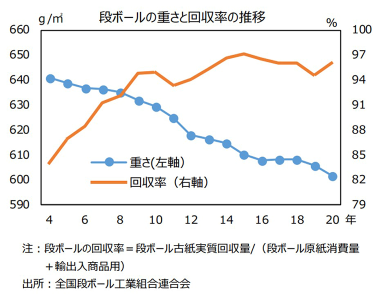 神様:その通りです。1990年以降の紙段ボール原紙の需要を見ると、紙・板紙の需要が減る中で底堅い推移が見られます。さらに、段ボールは年々軽量化が進んでいると同時に、行政が回収する体制が確立しています。全国段ボール工業組合連合会によれば、段ボールの古紙回収率は95%以上とのことです。