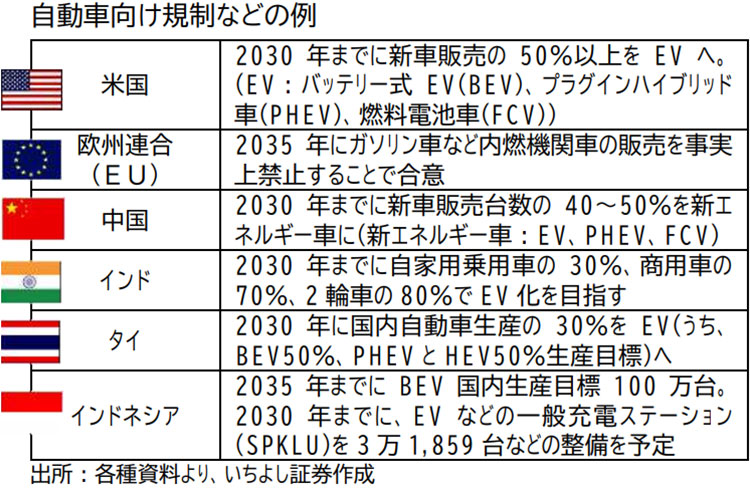 神様:その中でも要としての大きな取り組みは「自動車」です。すでに米国やEUなどの先進国だけでなく、中国、インド、タイ、インドネシアなどの新興国を含めてガソリン車への規制が進んでいます。各国では2030年まで、あるいは2035年までにガソリン車を電動自動車(EV)へ大きくシフトさせる計画が進行中です。