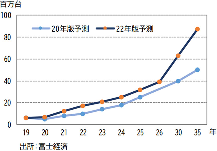神様:その通りです。この2022年版の予測は、2020年版の予測と比べると乗用車・新車販売台数が上方修正されています。つまり、世界的に自動車の電動化は加速していることがわかります。