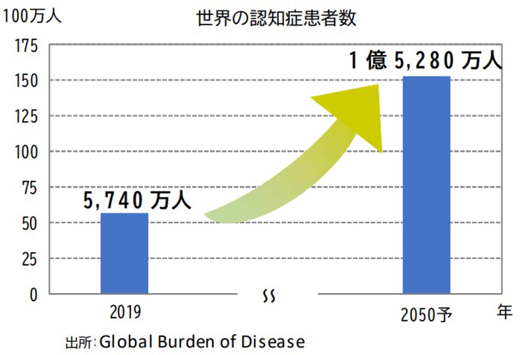 神様:世界疾病負荷研究(Global Burden of Disease=GBD)によると、世界の認知症患者数は2019年では5,740万人でした。2050年には1億5,280万人へと増加するとみられています。ちなみに日本だと、認知症の患者数は2020年で約602万人です。