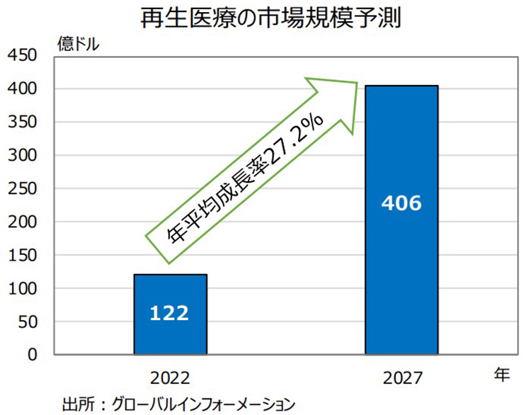 神様:はい。しかし、次世代医療としての再生医療は着実に拡大しています。世界の再生医療市場の規模は、2022年に122億ドルとなりました。今後、2027年には406億ドルへ成長すると予測されています。これは、年平均で27.2%の成長見込みとなります。市場の高い成長率のため、再生医療は産業としても大きく注目されています。現在は北米が再生医療市場の最大シェアを占め、今後さらに研究開発への資金提供や投資の増加によって拡大すると見られていますが、今後最も高い成長率が見込まれるのはアジア市場です。