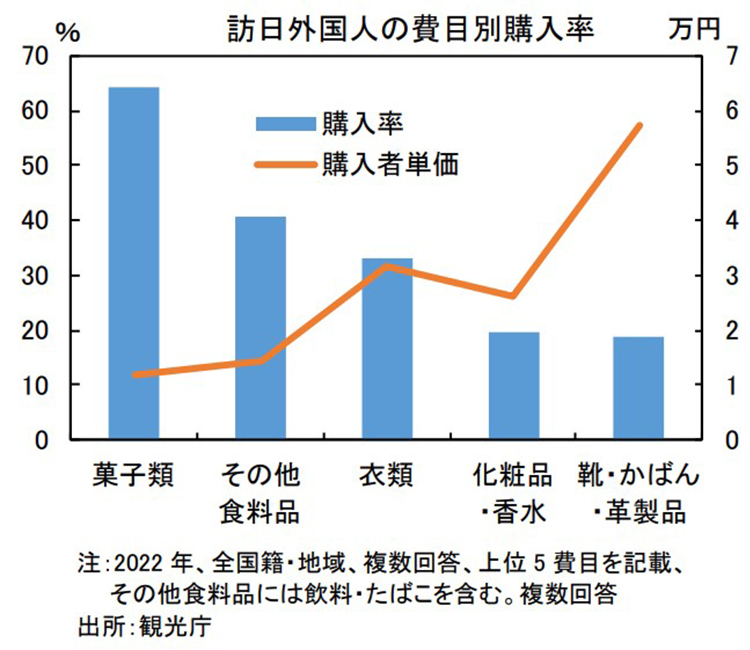神様:日本食の次に来るのが「買い物」です。お土産を買うことも含まれるでしょう。訪日外国人の品目別購入率を見ると、圧倒的に多く購入されているのは「菓子類」でした。