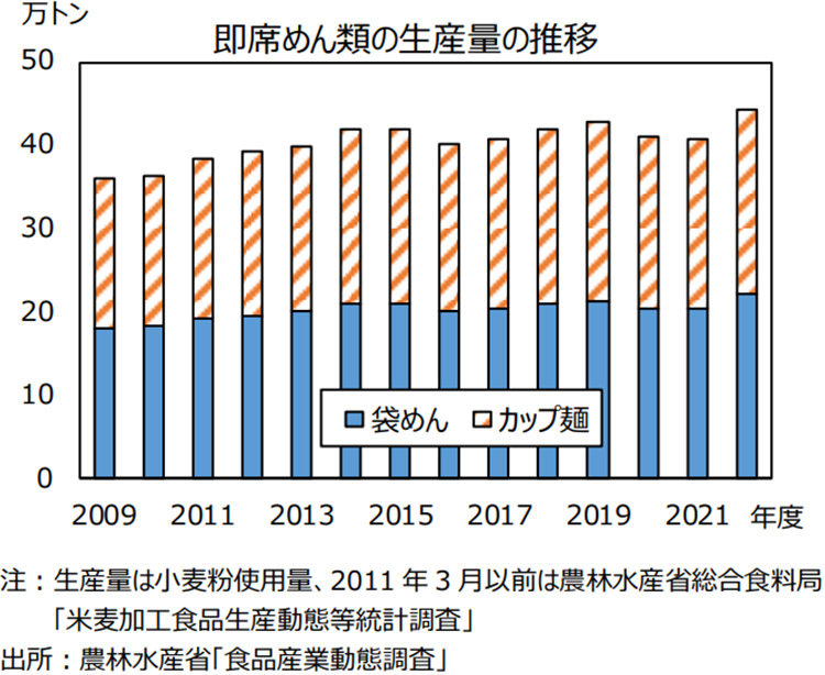 神様:実は今、インスタントラーメン市場が伸びています。日本即席食品工業協会調べによれば、2022年度の国内即席麺生産量は59億9,141万食となりました。これは前年と比べて1.8%の増加となり、2年ぶりに過去最高を更新しました。