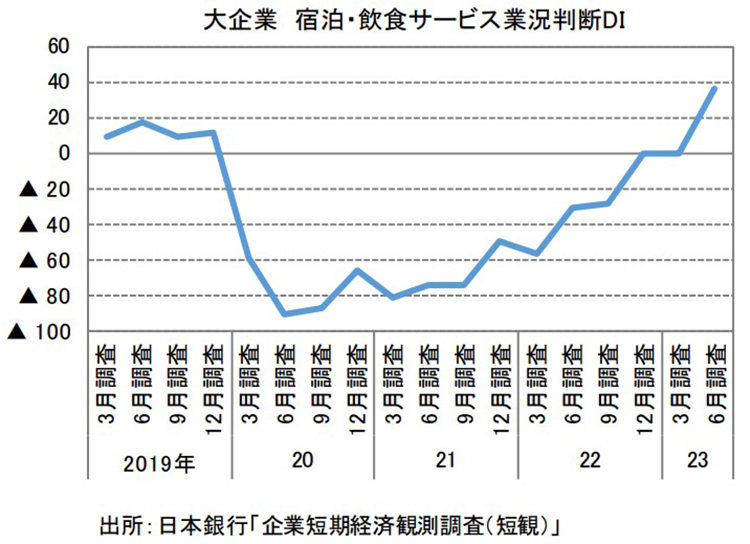 神様:その通りです。今回の短観では、全体的に景況感が改善していることがわかりました。業界ごとに見て改善幅の大きさで注目されたのが「宿泊・飲食サービス」業界です。最近の「宿泊・飲食サービス」業界の大企業の業況判断DIは36でした。今年3月調査では0でしたので、プラス36という大きな上昇幅となりました。