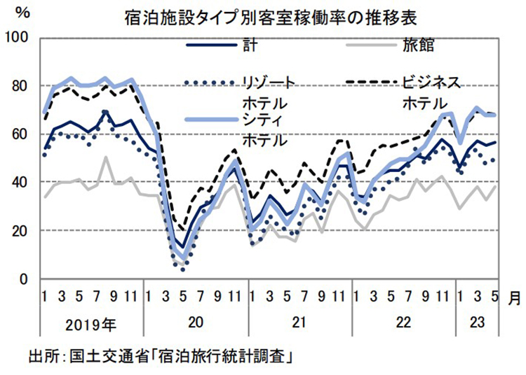 神様:まさにその通りです。宿泊施設タイプ別の客室稼働率の推移を見ると、コロナ禍からの回復の早さに差があることがわかります。シティホテルやビジネスホテルは比較的早い回復が見られますが、旅館やリゾートホテルは鈍い動きとなっています。