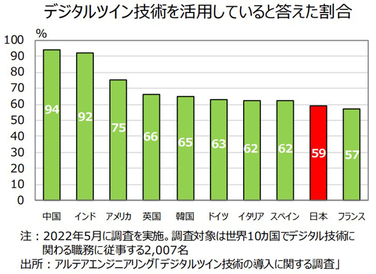神様:「次世代の」というのはちょっと違うかもしれません。デジタルツイン技術の普及率は国によって異なります。アルテアエンジニアリングが世界10か国においてデジタルツイン技術の導入に関する調査をしたところ、「デジタルツイン技術を活用している」と答えた割合が最も高かった国は中国で、活用率は実に94%でした。2位はインドで活用率は92%、その後にアメリカの75%、英国の66%と続きます。
