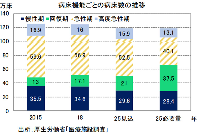 神様:そうですね。この集計を進めていく中で気になる点があります。4つの医療機能ごとの病床数について、2025年での見込みと実際に必要な量を比較すると、高度急性期、急性期、慢性期の各機能の病床が過剰となっている一方で、回復期機能の病床は不足しているということです。