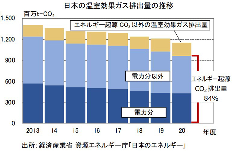 神様:ここでもう一度エネルギー政策について整理しておきましょう。政府は、2050年に温室効果ガスの排出量を実質的にゼロにする「カーボンニュートラル」の実現を目指しています。2021年度の日本の温室効果ガス排出量を見ると、84%がエネルギー起源のCO2で、そのうち電力分は37.6%を占めています。日本の電源構成比を見ると、2021年度では火力発電が70%を占めています。化石燃料の比率が高く、石炭、石油、LNG(液化天然ガス)を輸入に依存している状況です。
