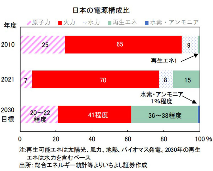 神様:2021年度の発電電力量の構成を見ると、再エネなど非化石電源の割合が増加し、火力が減少しています。また、原子力が増加し、エネルギー自給率の増加に寄与しています。カーボンニュートラルの実現にとって、原子力発電の活用は重要です。政府の方針では、原子力の電源構成比率を2030年に20~22%まで高めることとしています。それによって、エネルギー自給率の向上に寄与するだけでなく、出力が変動して安定しない再生可能エネルギーとの電力需給バランスの調整の役割も期待されています。