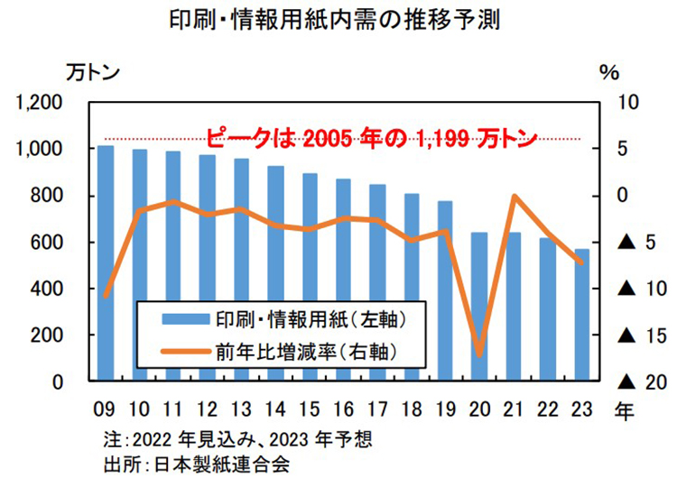 神様:おっしゃる通り、印刷媒体としての紙の需要は減少しています。日本製紙連合会によると、印刷・情報用紙の国内需要は、2005年の1,199万トンがピークでした。その後は今日まで、漸減傾向をたどっています。