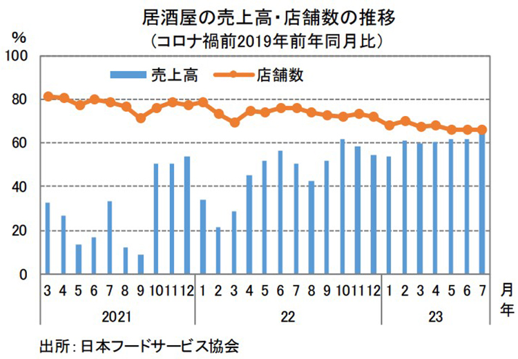 神様:今、飲食業の倒産件数が増加しています。日本フードサービス協会の外食産業市場動向調査によると、2023年7月の居酒屋の売上高は、コロナ禍前の2019年7月と比べて6割程度へと回復しています。