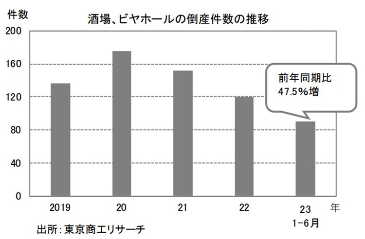 神様:その通りです。東京商工リサーチが公表した飲食業の前年同月比の倒産件数は、2022年11月から2023年6月まで、8カ月連続で増加しています。特に「酒場、ビヤホール」で見た2023年1月から6月の倒産件数は、前年同期比で47.5%増加となる90件となり、大幅に増加する結果となりました。