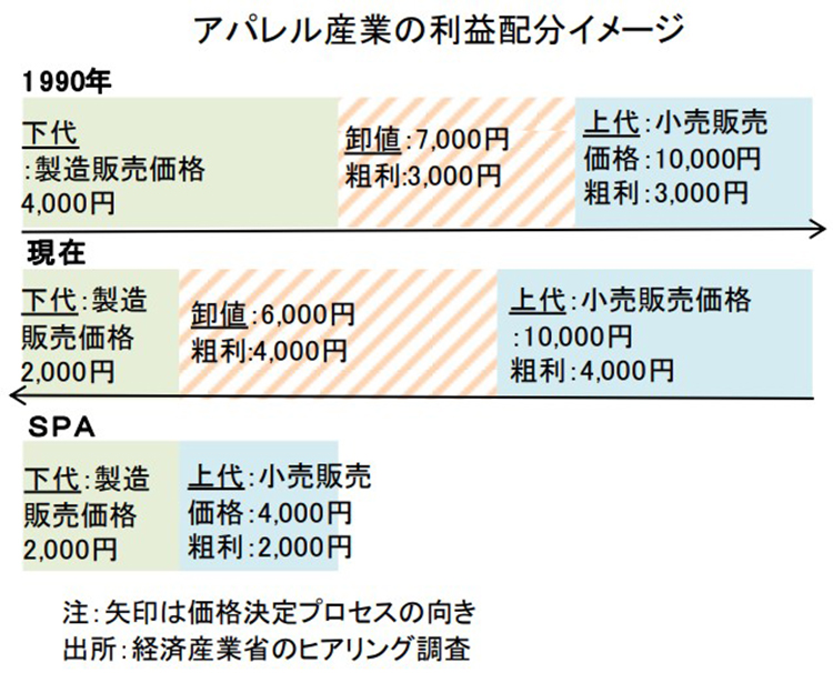 T:なるほど。昔はメーカーが衣類の価格を決めていたものが、お客様に近い小売が決定するようになったということですね。よく見ると、価格決定権を失ったメーカー側は利益配分が少なくなっていますね。