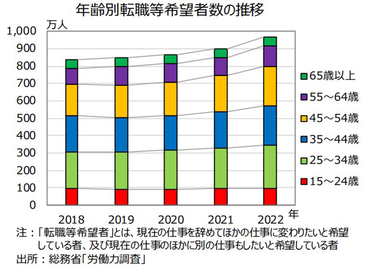 神様:2022年の労働力調査によれば、2022年の転職等希望者数は2021年と比較して7.9%増となる968万人となりました。