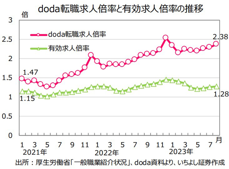 神様:民間の転職求人数も見てみましょう。こちらも増加傾向が続いています。転職情報サイト「doda」によれば、2023年8月の「doda転職求人倍率」は2022年8月と比べて0.1ポイント上昇となる2.38倍となりました。これは、dodaの転職希望者数1人につき2.38件の求人数(採用予定人員)があることを意味します。現在、有効求人倍率は緩やかに上昇しています。「doda転職求人倍率」の伸びはそれを上回って伸びていますから、転職者を採用したい企業のニーズが高まっていることがわかります。