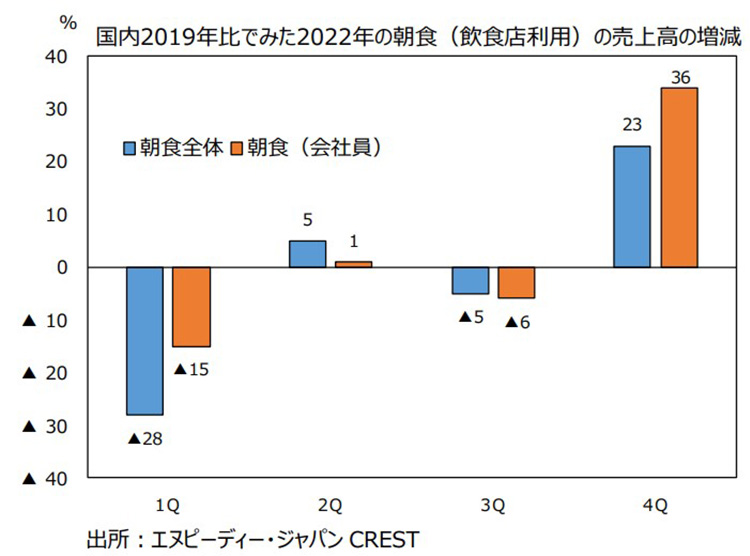 神様:実は今、外食・中食市場では「朝食」が注目されています。コロナ禍以降、朝食を外食でとる人が増えていることが要因です。エヌピーディー・ジャパン CRESTの調査によると、2022年4~6月期以降で朝外食が伸びており、コロナ禍前の2019年の売上を超えたことがわかりました。