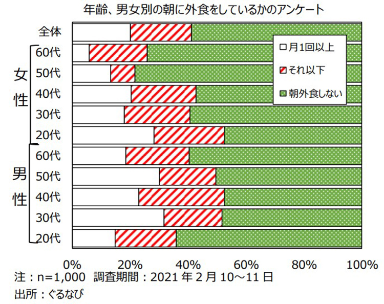 神様:ぐるなびが2021年に朝外食についてアンケート調査を行ったところ、月に1回以上朝外食をすると回答したのは20代女性、30代男性と50代男性でそれぞれ約30%となり、やや高い傾向にあることがわかりました。男性は平日の利用が多く、女性は平日・休日ともに利用される傾向があり、利用する店舗ではカフェや喫茶店が最も多く、次に多いのがファーストフード店でした。