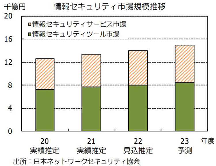 神様:侵入者は対処ができていないところを狙ってくるので、基本の徹底がサイバー攻撃を防ぐのに重要となるのです。国内でもサイバー攻撃への対応の重要性は高まっています。サイバーセキュリティの市場規模を見てみましょう。日本セキュリティネットワーク協会は、2023年度の国内の情報セキュリティ市場規模を1兆4,983億円と予測しています。コロナ禍以降で在宅勤務が増え、企業だけでなく、個人もサイバー攻撃によるリスクが高まっています。社会の情報通信ネットワークへの依存度が高まるほど、サイバー攻撃関連の通信は増加傾向となります。令和5年度情報通信白書を見ると、サイバー攻撃関連の通信数が2020年以降で急激に伸びていることがわかります。
