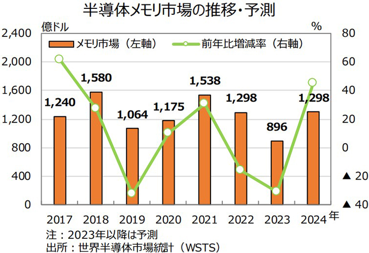 神様:はい。世界の半導体メモリ市場の推移を見ると、2023年が大きく落ち込んでいることがわかります。しかし、WSTSは2024年の半導体メモリ市場は前年比で44.8%増の1,298 億ドルになると予測しています。在庫調整が一巡し、需給の改善が図られることが市場の回復要因になると見られているためです。