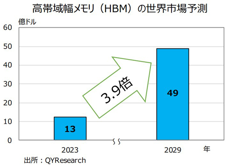 神様:生成AIの普及により、半導体メモリにも新たな需要が生まれています。生成AIは膨大な行列演算を行います。その数値データを一時保存するのは半導体メモリです。現在、生成AIには「HBM(高帯域幅メモリ)」と呼ばれる高容量のDRAMメモリが用いられています。したがって今後HBMの世界市場は、2023年から2029年にかけて3.9倍に拡大すると見込まれています。