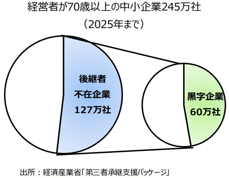 神様:中小企業の大きな課題は、経営者の高齢化による後継者不足です。この課題を解決する手段として、中小企業のM&Aが重要性を増しています。中小企業庁が2019年12月に発表した「第三者承継支援パッケージ」によると、2025年までに経営者が70歳以上で後継者が不在となる企業は127万社と予測されています。そのうち60万社は、黒字であるのに廃業してしまう可能性があるということです。