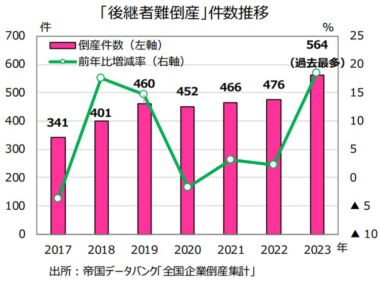 神様:既に後継者不在による企業の倒産件数は増加傾向にあります。帝国データバンクによると、後継者不在を理由とした2023年の倒産件数は前年比で18.5%増となる564件となり、過去最多を更新しました。企業の業種では建設業が最も多く、続いて小売業でした。