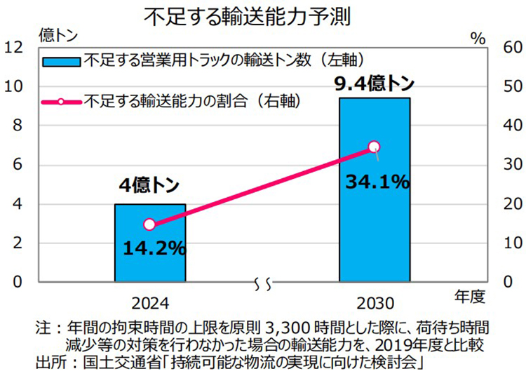 神様:国土交通省の「持続可能な物流の実現に向けた検討会」によれば、何も対策を講じなかった場合、2024年度の輸送能力は2019年と比較して14.2%不足すると試算しています。これはトラックドライバー14万人分の不足に相当します。さらに、2030年には34.1%の不足に拡大する見通しです。