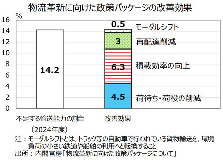 神様:トラックドライバーは、「荷待ち」と言って荷主の都合で待機を強いられる時間が多く、長時間労働の温床となってきました。「荷役」とは、貨物をトラックなどに積み込む、または降ろすことを言います。これらにかけられる時間が削減されることで、14.2%の不足のうち4.5%を補う改善効果があると試算されています。同様に積載効率を向上させるなどの効率化で6.3%、再配達の機会を削減することで3%、モーダルシフトで0.5%を補うと試算されています。