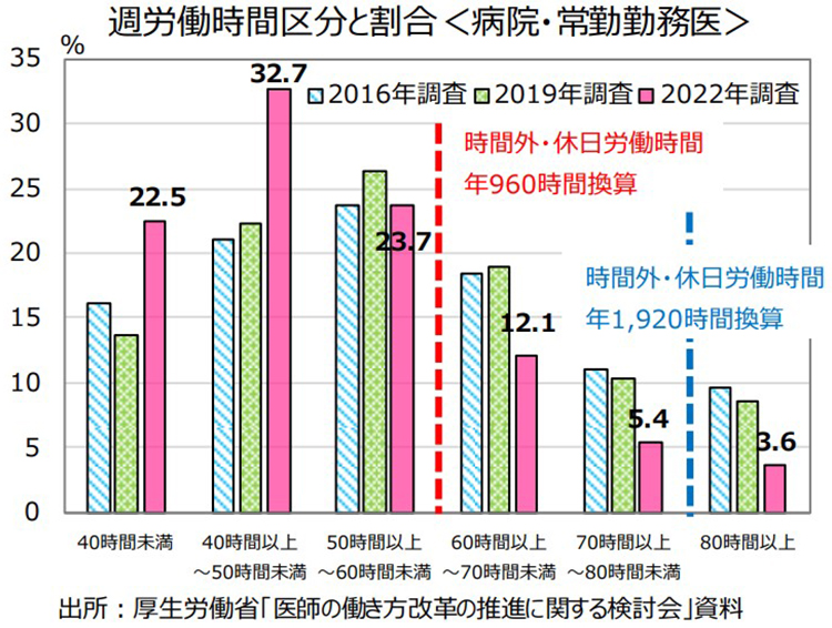 神様:厚生労働省による医師の勤務実態調査によれば、2022年の時点で時間外・休日の週労働時間が年960時間を超える医師の割合は21.2%でした。そのうち、年1,920時間を超える割合は3.6%でした。
