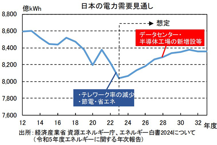 神様:ところが、です。電力広域的運営推進機関は毎年「全国及び供給区域ごとの需要想定」を公表しています。2023年度以前の公表では、日本の電力需要は「緩やかに右肩下がりの減少」を続けていく見通しとしていました。しかし、2024年度版では2023年から2024年あたりを底に2033年度あたりまで「右肩上がりの増加」に変化しています。