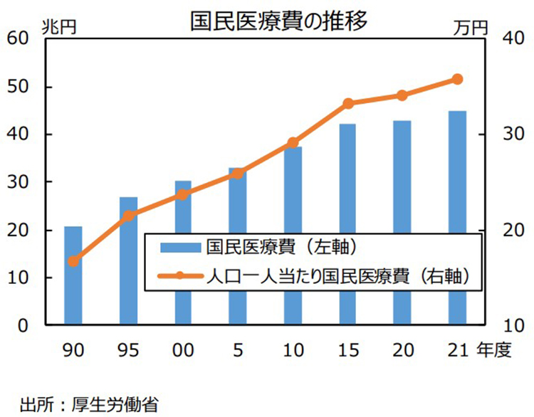 神様:少子高齢化が加速する中、日本の国民医療費が増加しています。1990年度の国民医療費は20.6兆円で、国民一人あたりの医療費は16.7万円でした。しかし、2021年度の国民医療費は45兆円で、国民一人当たりでは35.9万円へと増加しています。