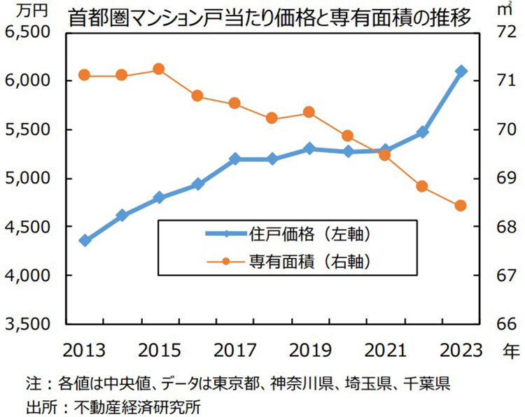 神様:そんな事情を反映し、首都圏の新築マンションでは、ここ最近は価格を抑えるために広さを抑えた物件が増えているようです。不動産経済研究所によると、2013年の首都圏のマンション販売価格(中央値)は4,348万円で、専有面積積(中央値)は71.1平方メートルでした。しかし、2023年は販売価格が6,098万円で専有面積は68.42平方メートルとなりました。