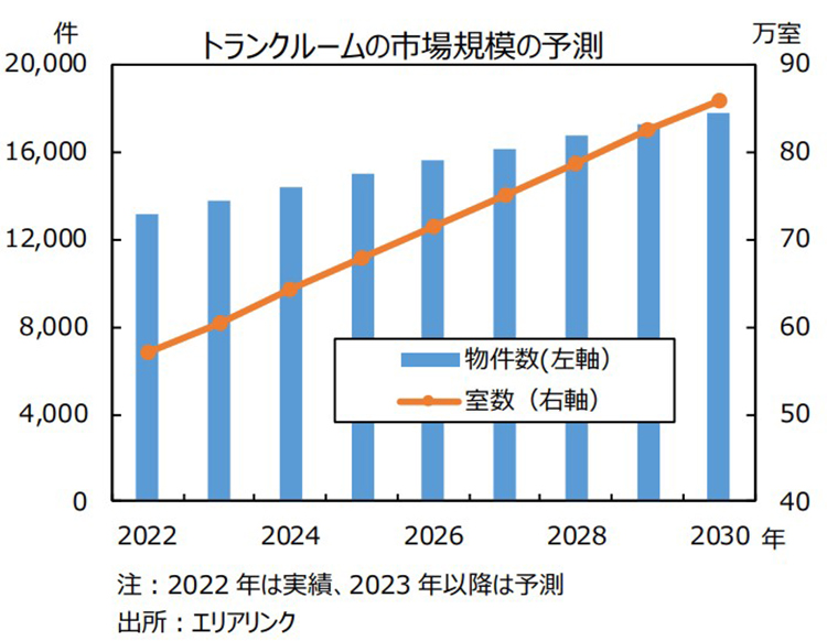 神様:コロナ禍以降、在宅ワークの増加によって自宅のスペースを確保したり、家にいる時間が長くなって整理整頓を行ったりと、使わないものを保管しておく場所が必要とされる機会が多くなり、需要が高まっているようです。レンタルトランクルームを運営するエリアリンクによると、2022年のトランクルーム市場は13,200件、569,800室でした。今後、2030年には17,800件、860,000室まで増加すると予測されています。