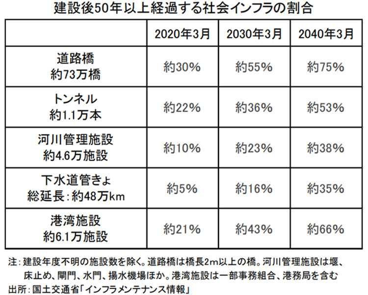 神様:集中して整備されてきた分、今後20年間で建設後から50年以上経過する施設の割合が高まる見込みです。すなわち、これからは一斉に老朽化するインフラを維持管理、または更新していくことが求められるということです。言い換えれば、今後は関連工事の需要が継続するとも想定されます。