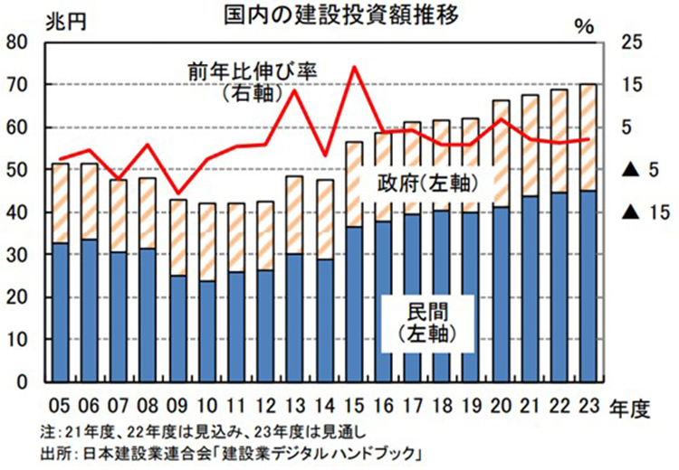 神様:国内の建設投資額は、2011年度以降で増加傾向です。2011年3月に発生した東日本大震災の復興需要、そして民間設備投資の回復が要因と言えます。2024年度予算における公共事業関係費を見ると、2023年度当初予算から26億円増となる6兆828億円です。そのうち4兆330億円が国土強靭化に対して計上されました。