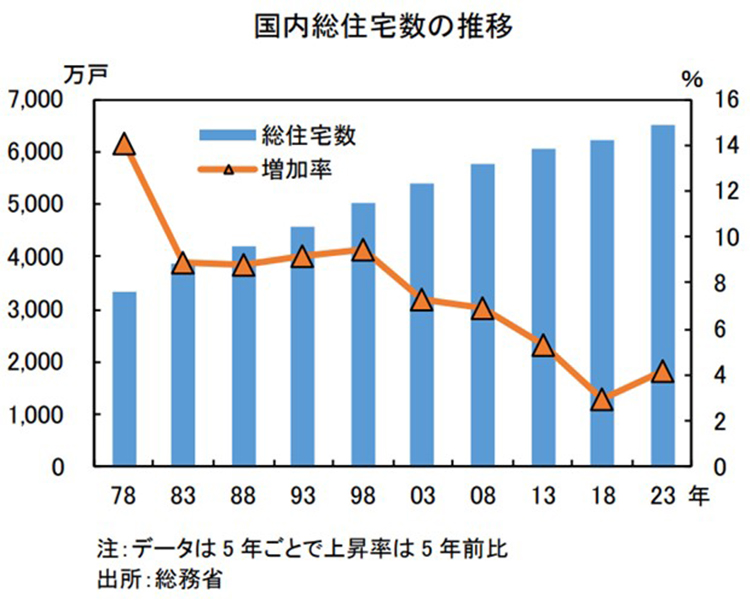 神様:総務省によると、2023年10月現在で日本の総住宅数は6502万戸です。これは2018年と比べて4.2%の増加であり、過去最多です。日本の住宅数は一貫して増え続けているのが現状です。