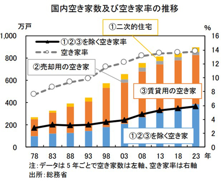 神様:2023年10月現在で、空き家は900万戸です。これは2018年と比べて51万戸の増加であり、こちらも過去最多です。空き家もこれまで一貫して増加し続けています。