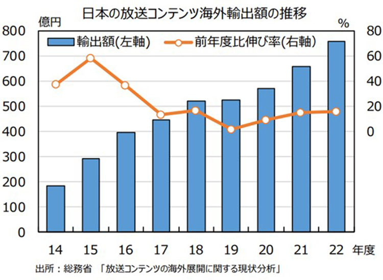 神様:おっしゃる通りです。日本発の放送コンテンツはアニメを中心にすでに世界中にファンが多いですが、今後さらなる拡大が期待できそうです。総務省の調べによると、日本の放送コンテンツの海外輸出額は、2022年度は前年度比で15.3%増となる756.2億円に達しました。2014年以降で輸出額は右肩上がりで増加していましたが、コロナ禍以降では伸び率が増加していることが分かります。