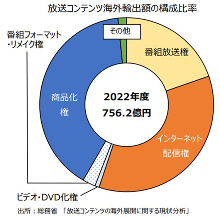 神様:その通りです。その他にも、放送番組をビデオ・DVD等の記録媒体にパッケージ化して販売する「ビデオ・DVD化権」やオリジナルの放送番組をリメイクし、海外で番組を制作して放送する「番組フォーマット・リメイク権」といったものもあります。2022年度の放送コンテンツ海外輸出額の中で、最も大きな割合を占めたものは何だと思いますか?