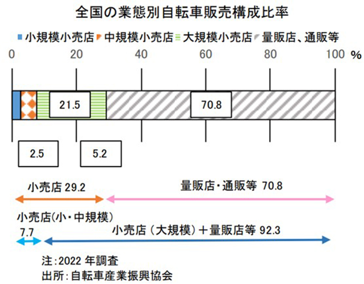 神様:全国の業態別自転車販売構成比率(2022年度)を見ると、小規模小売店の割合はわずか2.5%と非常に小さくなっています。中規模小売店でも5.2%です。大きな割合を占めるのは、大規模小売店、量販店や通販です。自転車は陳列に場所を取られますから、在庫の保管という点からも大規模小売店、量販店、通販が運営しやすいこともあり、ニーズがあります。加えて、小規模自転車店では後継者の問題もあるでしょう。今後もこの傾向は続くでしょう。
