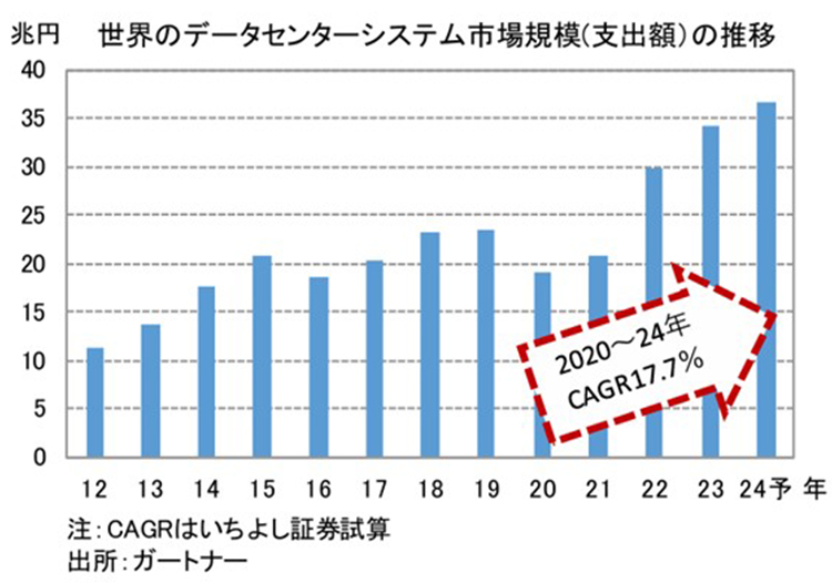 神様:生成AIの普及により注目されるのはデータセンターです。生成AIは高性能な画像処理半導体(GPU)などを搭載した専用サーバーを必要とします。サーバーはデータセンター内に設置されますから、データセンターの需要が急拡大しているのです。世界のデータセンターシステム市場規模を見ると、2022年から2024年にかけて急拡大している様子がわかります。