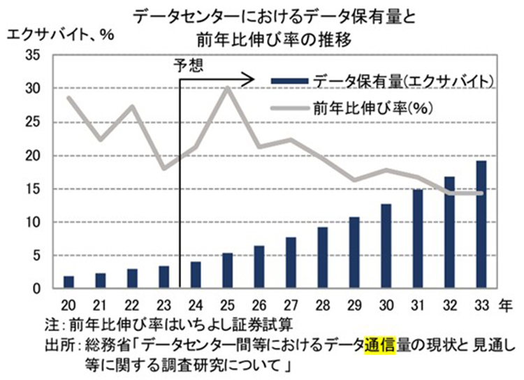 神様:総務省によると、データセンターにおけるデータ保有量は、2024年は4.0エクサバイトとの予想ですが、2033年には約5倍となる19.2エクサバイトまで伸びると予想されています。
